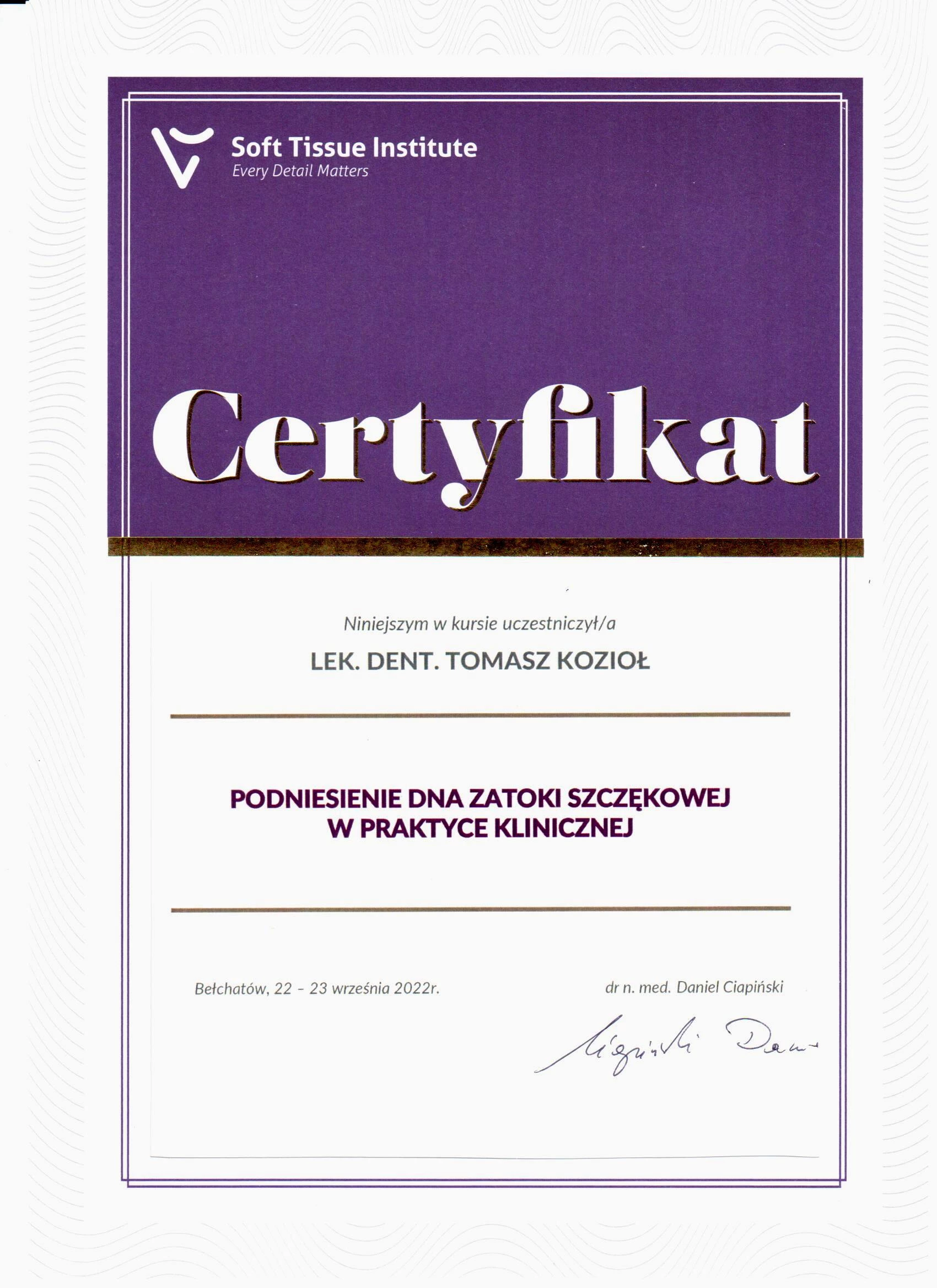 Członek ITI (International Team for Implantology) i PTChSiST (Polskiego Towarzystwa Chirurgii Stomatologicznej i Szczękowo-Twarzowej).